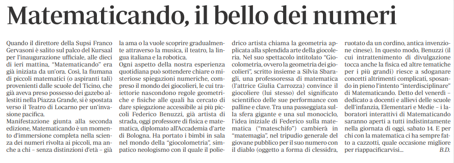 Leggi l’articolo “Matematicando, il bello dei numeri” pubblicato su la Regione il 14 maggio 2016.
