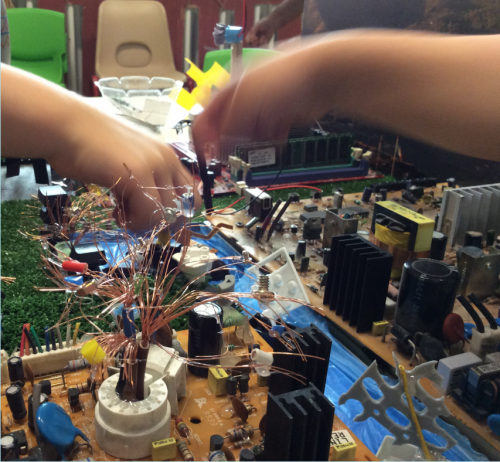I bambini vengono invitati a esplorare dispositivi elettronici, potendo smontare e “armeggiare” con le loro componenti, ipotizzandone il funzionamento. Gli obiettivi del laboratorio sono molteplici: classificare materiali diversi per tipologia ed uso, e costruire circuiti elettrici, piccoli robot, giocattoli meccanici, piste per biglie, meccanismi di reazione a catena, sculture.